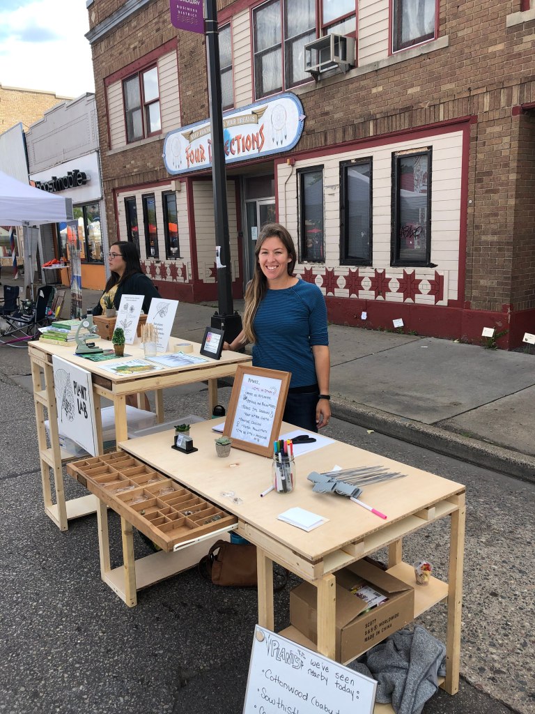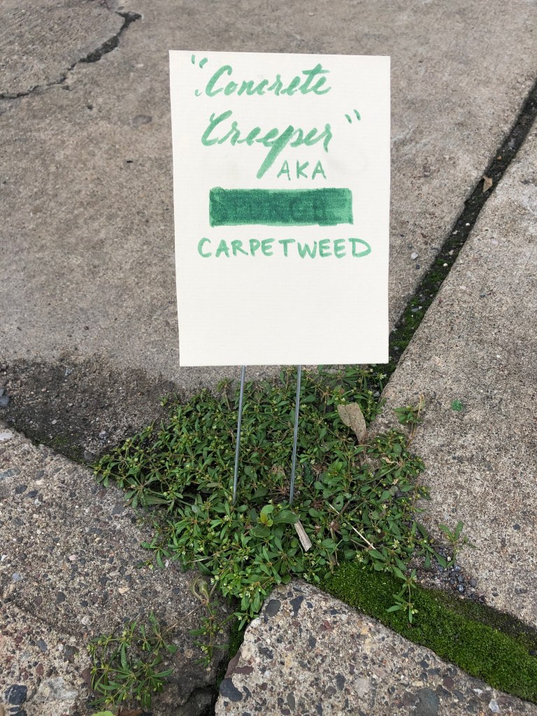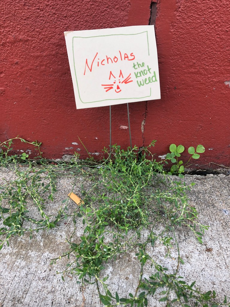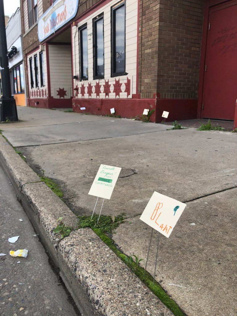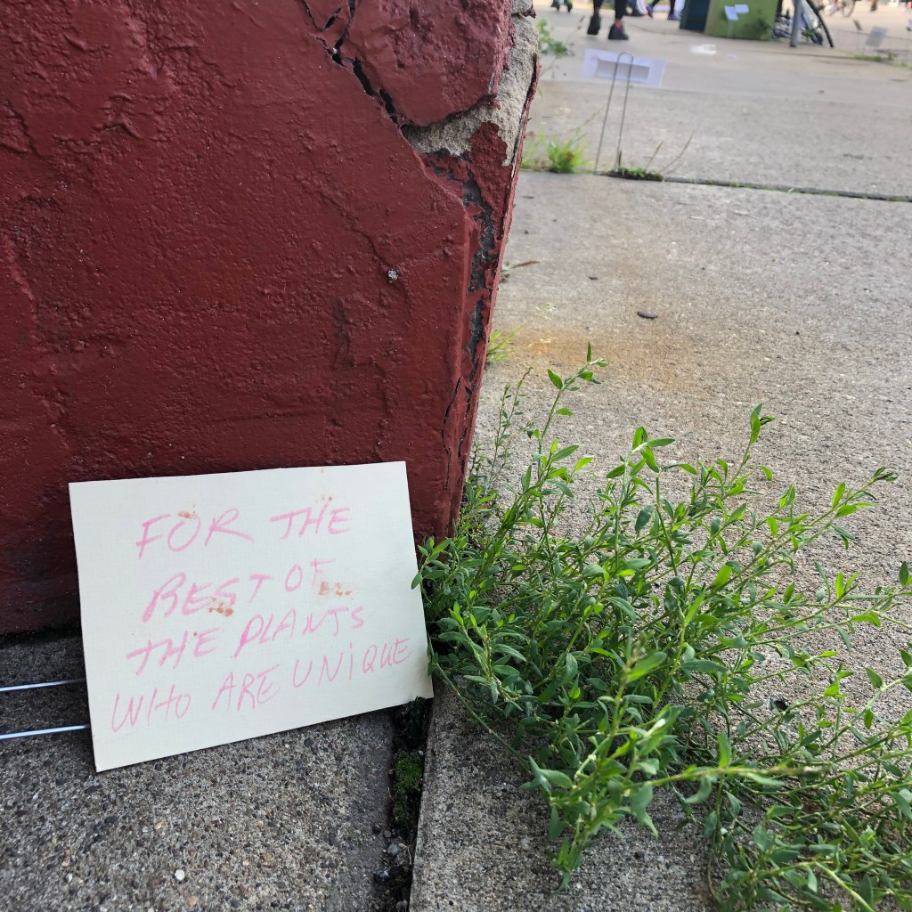 Notable Details: Across the street from an awesome youth dance studio, we had a constant soundtrack and, often, live performances just fifty feet away. We had plant conversations with over 70 people in four hours, and created plant labels for more than 25 different plants. “You sure have opened my eyes to these plants all around us,” one woman said. “Can I write ‘notice nature’ on a sign?” one little girl asked. “How do you spell that, please?” Folks learned that dandelion and lamb’s quarters are edible; learned how to recognize lady’s thumb by its dark green leaf blotch. A dandelion was named “Howie” by a two year old boy. Another little girl insisted on her dad reading aloud every one of the signs at the end of the afternoon, so she could learn all of the plants’ names. In twenty feet of cracked sidewalk, we found more than fifteen species of plants.